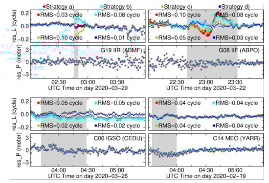 Carrier-phase and pseudorange residuals for different satellite types. Red, cyan, green and blue dots denote the residuals based on strategies (a), (b), (c) and (d), respectively. The gray zones denote the eclipsing periods of corresponding satellites.