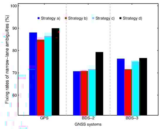 As shown in Figure 5, four strategies of the usage of attitude correction models indicate the different narrow-lane fixing rates. Strategy (d) achieves the highest fixing rates of all, about 90, 79 and 77% for GPS, BDS-2 and BDS-3, respectively. Generally, this strategy can lead to an improvement of about 10% for BDS-2 while GPS and BDS-3 satellites show modest improvements of less than 5% compared to other strategies. It shows that the attitude quaternions we used are helpful to improve the performance of fixing ambiguities, especially for BDS-2. In contrast, the narrow-lane fixing rates of strategy (b) are 85, 71 and 72%. This worst performance of fixing rates is mainly caused by attitude quaternions being only used at the network end to generate integer clocks, but not introduced at the user end, which leads to inconsistencies. With the nominal attitude corrections at both network and user ends, strategy (a) shows higher fixing rates than (b) and (c) except for BDS-2. However, strategy (c) achieves higher narrow-lane fixing rates within them, about 87, 72 and 75%. This phenomenon demonstrates the biases caused by the inaccurate attitude model cannot be absorbed into integer clock products entirely. The satellite clocks and orbits are also affected by the inaccurate attitude at the network end.