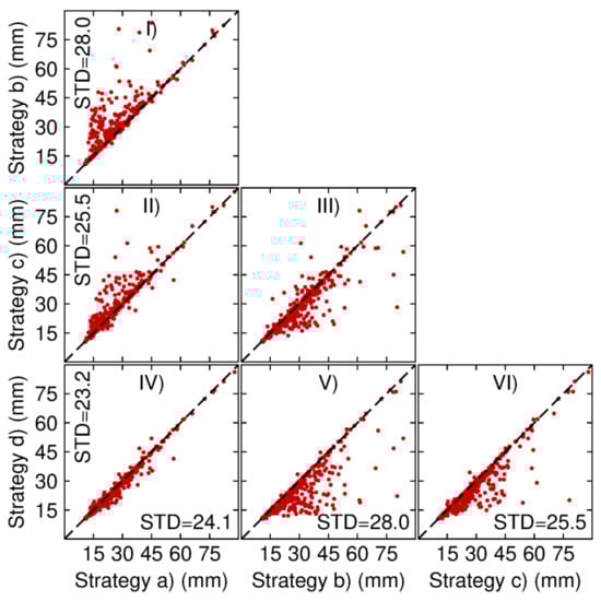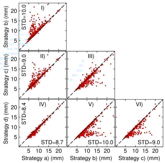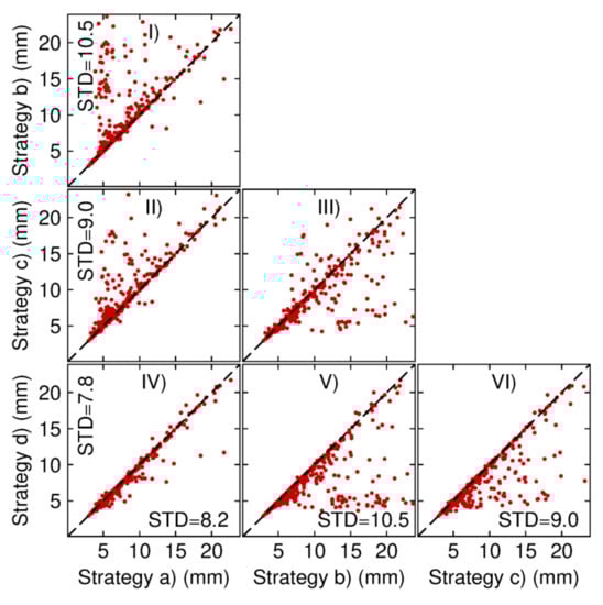Ambiguity-fixed mean standard deviations of position errors comparison in the east direction between the daily kinematic PPP-AR solutions based on strategies (a), (b), (c) and (d). For I-VI panels, each panel denotes the comparison of two strategies. Each red dot denotes a station. The standard deviations along the horizontal and vertical axes are the mean values of all stations.