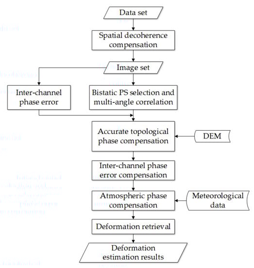 In this section, the signal processing for deformation retrieval is proposed: First the spatial decoherence is compensated for. Then, the BP algorithm is used to obtain the SAR images, and the PS points are selected and correlated. Next, the topological phase, inter-channel phase error and atmospheric phase error are also compensated in turn. Finally, the deformation can be calculated. A flowchart of the signal processing is shown in Figure 3.