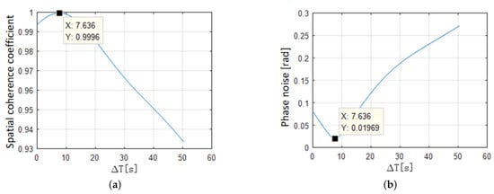 Performing spatial decoherence compensation on the collected three satellite datasets and taking the first two observation datasets of IGSO1 as an example, the minimum spatial decoherence model was optimized and solved. The results are shown in Figure 5a. The time offset was 7.636 s. Furthermore, from the system coherence noise corresponding to the spatial coherence shown in Figure 5b, when the system spatial coherence reached a maximum of , the mean square error of the phase noise corresponding to the system was about rad, and the corresponding deformation inversion error was 0.72 mm. It can be seen that spatial decoherence compensation can effectively reduce the effect of signal decoherence on the subsequent retrieval accuracy. The same processing method was used to perform spatial decoherence compensation on the remaining data groups; the time offsets after data alignment are listed in Table 3. The maximum offset was above 10 s.