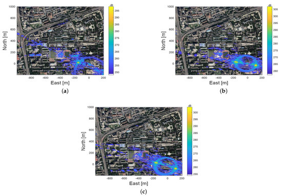 After spatial decoherence compensation, the image can be obtained based on the BP algorithm [36,37,38]. In this experiment, IGSO1, IGSO2, and IGSO4 satellites were used. Taking the data from 7 May 2019 as an example, the corresponding imaging results for the three satellites are shown in Figure 6a–c. The position of the antenna is the origin point, i.e., . It can be seen that there is a strong target at the origin point, which is because the echo antenna can receive the direct wave signal through the back lobe. Even if the gain of the antenna back lobe is not high, the amplitude of the origin point imaging result is still high because the signal is not reflected by the scene. From the comparison result with the optical image, it can be seen that the transponder and Gym both correspond to strong points in the three imaging results. However, for Building 1, it can only be seen in the image of IGSO1. This is because the radar cross section (RCS) of the target is different under different bistatic configurations, and for regular buildings, the RCS is small at some bistatic angles. In addition, in Figure 6b,c, due to the high elevation angle of the satellite and small bistatic equal-range ring radius, a strong image point appears in the non-observation area in the imaging plane, but the strong point will not affect subsequent interferometry processing.