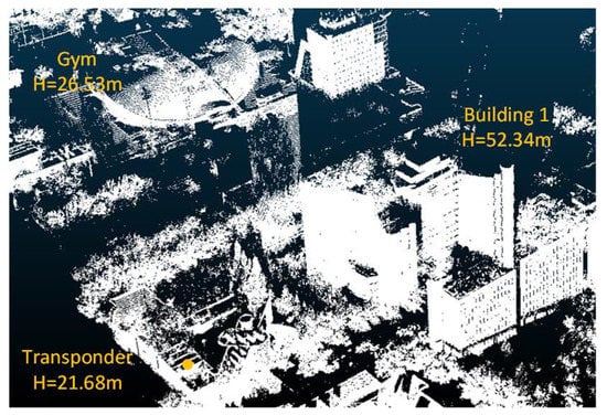 The experiment was located in Beijing Institute of Technology, Haidian District, Beijing (39°57′22.84″ N, 116°18′47.59″ E). The three selected IGSO satellites were all located to the east of the receiver. The experimental scene is shown in Figure 2. The imaging scene is a campus and the two main targets were named “Building 1” and “Gym”. The receiver, real-time processing board, and other equipment were deployed in a neighboring building, which is marked in Figure 2.