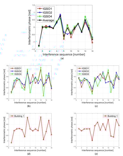 Thus, the inter-channel phase error can be compensated for through the phase at the origin. Figure 10a present the results for the three satellites and the average phase of the origin point. The average phase was used to compensate for the scene phase. The interferometric phase before and after inter-channel phase error compensation of the typical building area were extracted. Figure 10b,c present the results for Gym, and Figure 10d,e present the results for Building 1. It can be seen that after inter-channel error compensation, the phase change is reduced, which proves that the algorithm can be used for urban scenes.