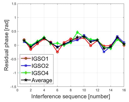 Residual phase of the transponder from three IGSO satellites and the average residual phase.