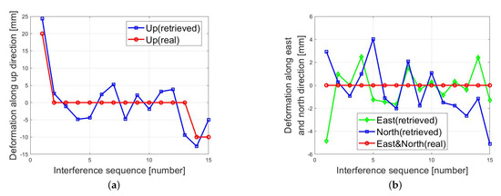 Estimated deformations with transponder displacement in all directions: (a) the result along the upward direction; (b) the result along east and north directions.