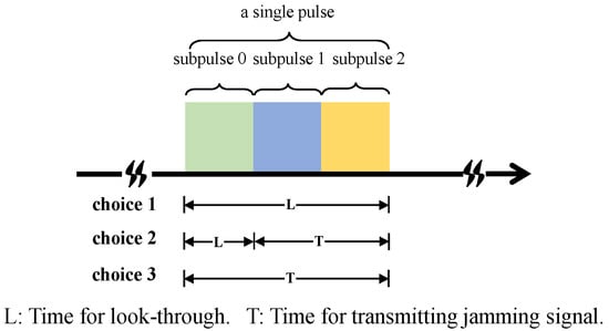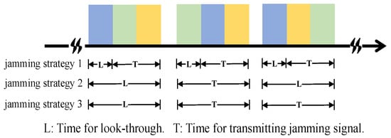 In this paper, it was assumed that the jammer works in a transmit/receive time-sharing mode, which means that the jammer cannot transmit jamming signals and intercept radar signals simultaneously. To jam the radar efficiently, the jammer cannot transmit jamming signals continuously because of the agility of the carrier frequency of the FA radar, and it will interrupt jamming to allow time for the jammer to catch up with the current radar parameters, which is referred to as “look-through” [].