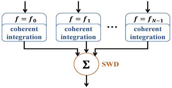 To simplify the analysis, we assumed that the frequency step was large enough to decorrelate the target returns. In one CPI, the target returns with the same subcarriers can be first integrated coherently, and then, all coherent integration results of all subcarriers can be processed by the SNR weighting-based detection (SWD) algorithm []. This procedure is illustrated in Figure 2, and the detailed calculation procedure of is given in Appendix A.