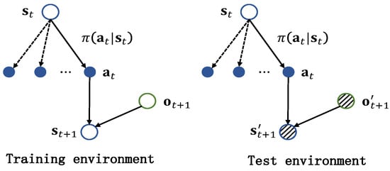 From an RL perspective, uncertainties in the radar and the jammer will result in a discrepancy in the transition probability between the training and test environments. A detailed explanation is given as follows. In Figure 3, the left and right images illustrate the transition probability in the training and test environments, respectively. When the radar is in the training environment, the current state of the radar is , and it will choose an action according to the policy , as shown in the left image in Figure 3. Based on the perfect sensing and interception assumption, the observation of the radar is , and the next state will transition to . When the radar is in the test environment, it is assumed that it is also in and chooses an action , which is the same as the radar in the training environment. The difference is that the observation of the radar may not be the same as due to errors caused by the jammer. In the right-hand image in Figure 3, we use a circle filled with dotted lines to distinguish it from the observation in the training environment. As a result, the next state will not be . Given the same current state and action , the resultant next state is different. Therefore, there exists a discrepancy between the transition probability in the training and test environments. Thus, we considered a robust antijamming strategy design problem, where the transition probability of the test environment deviates from that of the training environment.