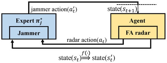 As shown in Figure 4, gathering the expert trajectories can be achieved based on of the radar antijamming strategy design. At time step t, the jammer action is actually the observation in , and the state can be obtained from , with the input being the state in . Here, is a function that maps from to and is designed to extract useful features for the jammer. Once the trajectories are obtained, imitation learning methods can be used to derive its policy.