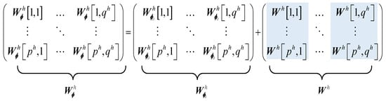 To alleviate the problem mentioned above, we propose an alternating procedure, inspired by NoisyNet, to perturb the jamming parameters []. More specifically, can be expressed by the combination of two terms, the reference jamming parameters and an extra term that can be expressed as . To reduce the number of parameters that need to be perturbed, the elements in each column of were set to be the same, which means that only variables need to be perturbed. The relationship between the hth element in , the hth element in and the hth element in is displayed in Figure 5, and the mathematical expression is as follows:
