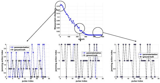 For a better understanding, Figure 8 presents the learning results of the derived jamming strategy for Jamming Strategy 1 in multiple phases. Here, the radar adopted a random strategy to select subcarriers. The derived jamming strategies were used to jam the random radar when their Wasserstein distance was 0.17, 0.025, and 0. The actions of the jammer induced by the derived jamming strategies and predefined Jamming Strategy 1 are plotted in Figure 8, which are denoted as “parameterization” and “ground truth”, respectively. It can be seen that the difference between the actions induced by the derived jamming strategies and predefined Jamming Strategy 1 became smaller as the Wasserstein distance decreased.