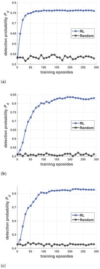 Before presenting the results of the robust antijamming strategy design, we first present the training performance against three different jamming strategies under the perfect interception assumption. As shown in Figure 10, the performance obtained through the RL algorithm (TRPO was used here) was compared with the performance of a random strategy to show its effectiveness (random strategy means that the radar chooses actions randomly at each pulse).