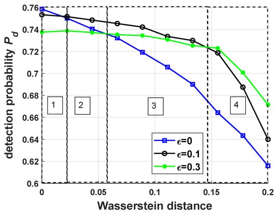 The probability of detection for Jamming Strategy 1 with respect to different magnitudes of the Wasserstein distance. The four rectangles with dotted lines correspond to different stages.