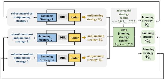 To overcome the uncertainties in both the radar and jammer, a robust antijamming strategy design method for FA radar is proposed in this paper. FA radar and main lobe jamming with a transmit/receive time-sharing jammer are considered and modeled within the framework of RL. The proposed robust method was based on imitation learning [] and Wasserstein robust reinforcement learning () [], where imitation learning was used to learn the jammer’s strategy, and was utilized to design a radar strategy that was robust against uncertainties in the jammer’s strategy and itself. The main contributions of this paper are summarized as follows: