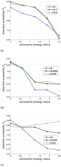 The probability of detection for three different jamming strategies with respect to different adversarial strategy radii. The x-axis is the radius of the -Wasserstein ball when the adversarial strategies were generated. (a–c) presents the detection probability for Jamming Strategy 1, 2 and 3 respectively with respect to different adversarial strategy radii.