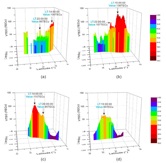 - Romero-Hernandez, E.; Denardini, C.M.; Takahashi, H.; Gonzalez-Esparza, J.A.; Nogueira, P.A.B.; De Padua, M.B.; Lotte, R.G.; Negreti, P.D.S.; Jonah, O.F.; Resende, L.C.A.; et al. Daytime ionospheric TEC weather study over Latin America. J. Geophys. Res. Space Phys. 2018, 123, 10345–10357. [Google Scholar] [CrossRef]