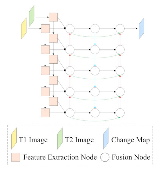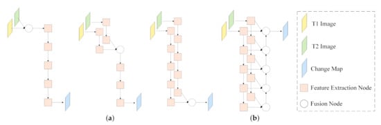 (1) The flexibility and diversity of information propagation are hindered by the one-way fusion flow. It has been proved that low-level features, which are extracted by shallow convolutional layers, are helpful for large instance identification [,]. However, one-way fusion flow merges features in a top-down or bottom-up way, leading to a monotonous and restricted path from low-level features to high-level features, and thus increases the difficulty in aggregating accurate localization information of the changed areas. In this case, several guidelines for improving feature aggregation, such as shortcut connection [,], dense connection [], and parallel paths [], can be beneficial.