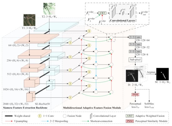 (1) We propose a new multidirectional adaptive feature fusion module (MAFFM) for RSCD, which consists of a multidirectional fusion pathway (MFP) and an adaptive weighted fusion (AWF) strategy to perform cross-level feature fusion efficiently. The MFP fuses different features in bottom-up, top-down, and shortcut-connection manners to overcome the limitation of one-way information flow and improve the process of feature fusion. The AWF strategy provides adaptive weight vectors for features from multidirectional edges to consider their semantic relationship and emphasize vital feature maps.