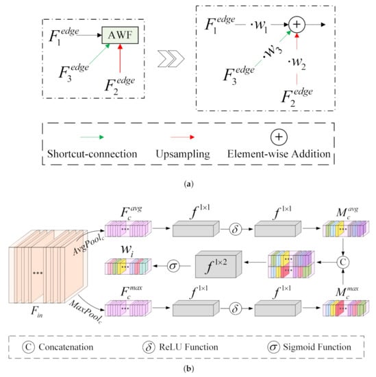 In order to provide appropriate and learnable weight vector , we utilize a channel attention algorithm in each input edge of the fusion node to generate a channel-wise attention map and take it as the weight vector. The channel attention algorithm is inspired by a previous study []. Figure 4b shows the detailed process of obtaining a weight vector . Given the input features , we first perform global average pooling and global max pooling on along with the channel dimension to obtain two different spatial context descriptors and . Then, and are separately sent into two 1×1 convolutional layers to generate average-pooled feature and max-pooled feature . Afterwards, we fuse and together to generate by using a 1×2 convolutional layer. Formally, this process can be computed by: