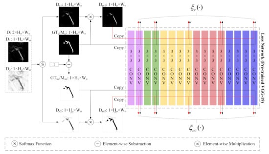 The predicted change map is determined by two feature maps and of the discriminative map D. By performing a SoftMax operation on D along the channel axis, and are transferred to and , respectively. The value of each pixel of represents the probability that the pixel belongs to the changed class, while that of represents the probability that belongs to the unchanged class. Therefore, to obtain an accurate predicted change map, should be consistent with the ground-truth changed regions label while should match with the ground-truth unchanged regions label . Based on this fact, we propose a novel perceptual similarity module to calculate the perceptual loss of specific areas (i.e., the changed regions and the unchanged regions), which could embed perceptual information into our network and shorten the distance between and , as well as the distance between and in high-dimensional feature spaces. The detailed architecture of the PSM is shown in Figure 5. To compute the perceptual loss for a specific region, we need to generate binary masks that have a pixel value of 1 over the region of interest and 0 elsewhere. Since the ground-truth change map has a pixel value of 1 in the changed area and 0 in the unchanged area, it can be used as the binary mask of changed regions and can also be regarded as the ground-truth changed regions label . The binary mask of unchanged regions and the ground-truth unchanged regions label can be made by . Afterwards, () is element-wise multiplied by (), so that () is converted to a black and white masked feature map () where only the regions of interest are visible. Now, all non-zero distances in the feature space between the masked feature map () and its ground-truth () correspond to the visible areas, i.e., the changed (unchanged) areas. Following the guidance of previous works [,], we utilize a VGG-19 model pre-trained on ImageNet as our fixed loss network to compute the perceptual loss. Low-level features of VGG-19 contain local information such as edges and textures, while high-level features of VGG-19 contain abstract information such as semantic concept and image content. Therefore, in order to obtain comprehensive information from the VGG-19 fixed loss network, we calculate distances in both low-level and high-level feature spaces of VGG-19 to form our perceptual loss. The function to calculate the distances is defined as:
