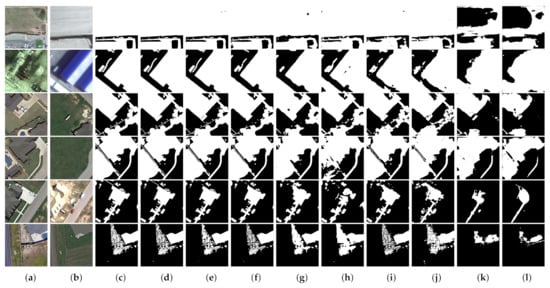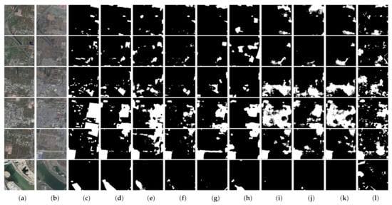 The third dataset, named the Google dataset [], consists of 20 season-varying VHR image pairs with a spatial resolution of 55 cm, and sizes ranging from 1006 × 1168 pixels to 5184 × 6736 pixels. This dataset covers the suburb areas of Guangzhou City, China, and is used for building change detection. It is divided into 256 × 256 pixel nonoverlapping patches with at least a fraction of changed pixels, where 1156 pairs of sub-images are generated. The sub-image pairs were randomly divided according to a ratio of 7:2:1 to generate training, validation, and test sets. Afterwards, the training set was rotated by 90, 180, and 270, and flipped in horizontal and vertical directions for data augmentation. Finally, we obtained 4848 sub-image pairs for training, 232 for validation, and 116 for testing.