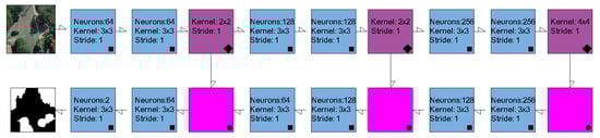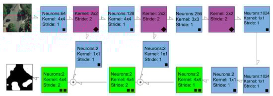 Fully Convolutional Network (FCN): FCN architecture is presented in Figure 4. It was proposed by [44]. This deep network creates a classification map with a set of convolutional layers returning a spatially reduced result. After that, it applies deconvolution layers to upsample the initial classification and produce a dense prediction, restoring the image’s original resolution.