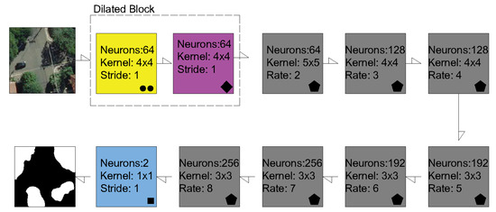 Dynamic Dilated Convolutional Network (DDCN): Proposed by [35], the DDCN is designed to preserve the input image resolution. Ref. [43] describe this network in more detail. However, in summary, the Dynamic Dilated Convolutional Network uses a multi-scale training strategy that implements dynamically-generated input images to converge a dilated model that does not downsample the input data due to a specific configuration of stride and padding. The model has eight dilated blocks; each block comprises a dilated convolution and a pooling layer; the blocks are followed by a standard convolutional layer responsible for the final prediction map. In each iteration of the training procedure, a dimension is randomly selected from this distribution and used to create a new batch. The model captures multi-scale information by processing these batches with a pre-determined size, advancing in the processing phase. The network selects, based on scores obtained during the training phase for each evaluated input size, the best image resolution. Then the DDCN processes the testing images using batches composed of the images with the best-evaluated size (Figure 8).