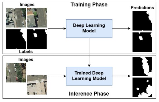 The capability of detecting individuals and groups of trees is essential for many applications in forest monitoring according to [16], such as resource inventories, wildlife habitat mapping; biodiversity assessment; and threat and stress management. Nevertheless, the task of mapping trees, especially for an urban context, is a crucial procedure for environmental planning [10,17]. The urban tree segmentation task refers to the automated classification of each pixel of a given image into a tree or background, and that is a challenging problem. As highlighted before, urban forests are a particular form of forest with unusual characteristics as they can be isolated, densely, or sparsely distributed and mixed with other urban features [18]. All these characteristics make automated urban forest mapping a complex computational task. Therefore, it requires high spatial resolution images and a robust machine learning process to differentiate them as objects. The consolidated approach for mapping trees using remote sensing refers to the use of data acquired from sensors embedded in satellite, airplane, or Unmanned Aerial Vehicles (UAV) [19,20,21,22,23,24]. Remote sensing can provide valuable data at different acquisition levels to support policies related to urban forest mappings such as forest health, regulation, climate change mitigation, and long-term sustainability. As a result, continuous remote sensing tracking of forest patterns allows for cost-effective periodical assessment of vegetated areas [25], supporting decision making.
