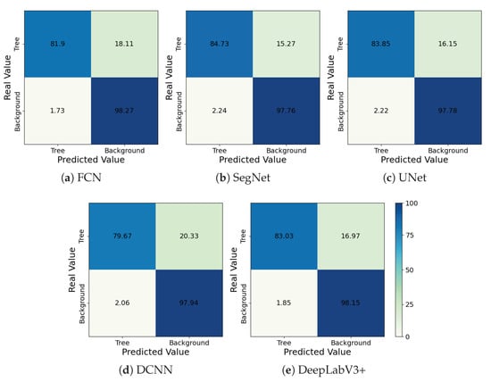 For a practical approach, the final use of this method is the application in a city to detect vegetated areas. For our example images, we have a range of pixel accuracy of 96.18% to 95.56%. These remaining percentage not correctly classified in our test dataset is explained in Section 3.3 as the CNNs are known for producing errors in image-boundaries [55,56]. Moreover, most of the problems faced by the investigated deep networks are related to shadowy areas, isolated and small trees, and the grass and bush areas inside the images. Things for the CNN and even for the human operator can be a little ambiguous. Some solutions for these kinds of problems are the labeled dataset be manually segmented by more than one operator, creating a more detailed and overlapped map of the trees inside an area, we also can augment the dataset using techniques, such as the presented in the Section 2.2.1. The analysis of the classification results shown in Table 1 demonstrates that the deep neural networks are lacking accuracy if compared to our annotations; the result of the IoU metric demonstrates this. Regardless, the visual output of the segmentation methods is rather noisy in some of the patches. Shadows were a problem, even more, when mixed inside large groups of trees; when they are further away from our object of interest, CNNs have fewer issues in segmenting them. However, small isolated trees were a higher challenge for all the networks to deal with, especially when they are inside the same patch as large groups of trees; all the CNNs tend to miss-classify and even ignore them. The grass and bush areas were more of a problem when they were near large groups of trees, and the CNNs might interpret them as a continuation of the tree patches and classify them as trees, creating false positives.