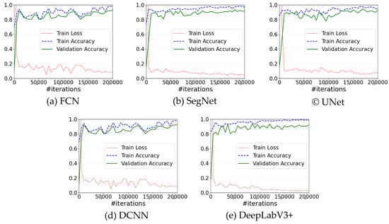 Finally, we present in Figure 11 the accuracy and loss curves. We can see that the FCN, UNet, and SegNet performed similarly with stable slight variation and close to the minimum loss value after 100,000 iterations or half the way of the learning process established. The DCNN presented some increase in loss after 100,000 iterations. After the learning rate was reduced in the lasts 50,000 iterations by the SGD scheduler, it reached its minimum value, and the loss fluctuations were reduced. Moreover, the DeepLabV3+ became stable after 100,000 iterations with the minimum loss observed.