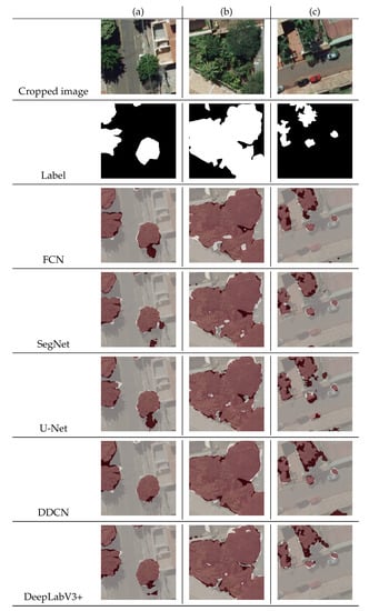 In row (a) of Figure 14, we have large tree canopies and a road with a rooftop background, and all the CNNs performed reasonably well with large canopies segmentation except for U-Net and the FCN that faced a difficult time segmenting the shadowed areas in this case. In row (b) of Figure 14, we have a large patch of trees that are beneath a residential area, and the networks performed similarly in this case of one large group of trees even for the false positives case of the shadows, but we can see that in this case, DeepLabV3+ was the most assertive CNN. In row (c) of Figure 14, we have a small patch of trees located beneath houses and cars. As discussed previously, we have the most significant part of the errors with the isolated and small trees, shadowed areas, and grassed and bush areas.
