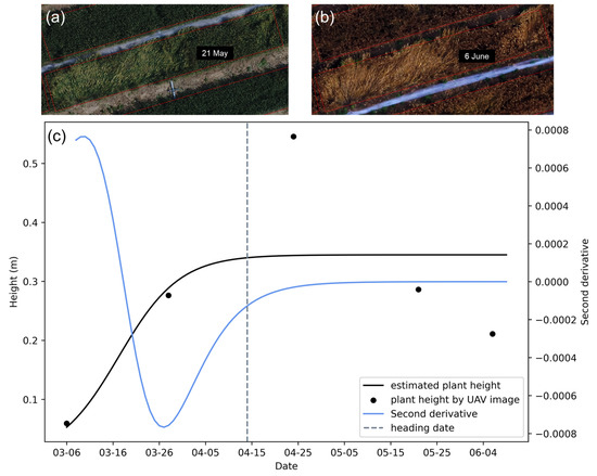 Some plots showed a sharp decrease in plant height at a later growth stage compared to the previous UAV measurements. The plant height in the plot (sowing date: 5 October; variety: Xinong 529; density: 4.5 million plants/ha) decreased markedly on 21 May and 6 June because of lodging, resulting in an abnormal fit of the growth curve (black line) and causing an error in the second derivative (blue line), eventually leading to the largest error (18 d) in the estimated heading date (Figure 7).