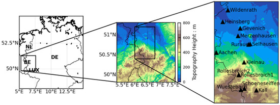 The study area is located in central Europe encompassing parts of North Rhine-Westphalia and Rhineland-Palatinate in western Germany and parts of Belgium, the Netherlands and Luxemburg, covering an area of 150 × 150 km (Figure 1). This region has a sub-Atlantic oceanic climate. Summers are mild, while winters are humid and relatively mild. The average monthly temperatures are highest in July (18 °C) and lowest in January (3 °C). There is a large spatial variability in precipitation due to topography. In the rather flat Lower Rhine area in the North of the study region, the yearly precipitation is between 600–900 mm [49]. In the southern low mountain ranges the average yearly precipitation is locally 1600 mm in the Bergisches Land (South East) and 1300 mm in the Eifel (South West) [50]. The rainfall is frequent and evenly distributed over the seasons. The elevation in this area ranges from the plains at around 14 m a.s.l. to the mountainous areas at around 735 m.
