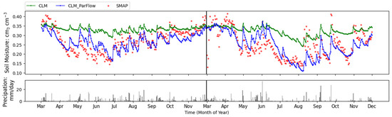Figure 4 shows daily mean soil moisture content in the upper soil layer (5 cm) over the research area for CLM and CLM-ParFlow simulations compared with the SMAP L3_SM_P_E product, together with daily precipitation time series. The SMAP product and model simulations have different soil wetting and drying dynamics after rainfall. The near-surface soil is sensitive to precipitation because of intensive positive vertical water gradients, but tends to dry quickly after water infiltration related to evaporation [86]. Although the representation of L-band sensing depth at 5 cm has been using for remote sensing validations [26,87,88]; however, the L-band sensing depths are affected by soil moisture, and the penetration depth can be shallower when soil moisture is high [89]. The penetration depths and vertical soil moisture gradients lead to different drying behavior. The simulations match soil moisture from SMAP well during most of the year. Generally, CLM overestimates the soil water content during summer. Compared to SMAP, CLM-ParFlow simulations show a very small wet bias of only 0.004 cm3/cm3 while CLM has a larger wet bias of 0.065 cm3 cm−3. The RMSD for CLM and CLM-ParFlow simulations are 0.085 cm3 cm−3 and 0.045 cm3 cm−3 respectively.