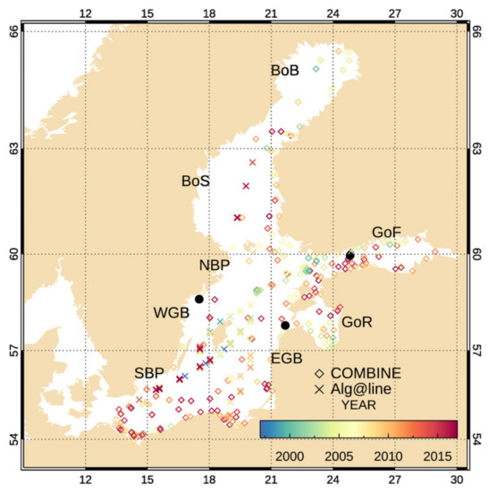 The second set of records is the COMBINE database hosted by the International Council for the Exploration of the Sea (ICES), that includes measurements collected by several institutions within the HELCOM environmental monitoring activities. measurements were performed with techniques spanning from fluorimetry to spectrophotometry and HPLC, from the 1970s to date. All data and the different analytical protocols are subject to a well-established quality assurance policy regulated under the HELCOM COMBINE marine monitoring program [6,7]. Data acquired in the Skagerrak and Kattegat regions were not included in this analysis as the physical and optical water properties of these basins are deemed different from the actual Baltic Sea [20,26].