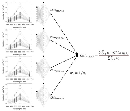 To combine estimates obtained with different MLPs based on at specific wavelengths’ subsets, the weight definition is based on the assumption that the lower the novelty index , the more suitable the computed value [57,58]. Among the possible MLP ensemble configurations, this study will focus on the performance of the ensemble solutions based on four MLPs (: , , , ) and on three MLPs (: , , ).