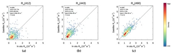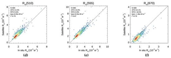 Scatterplots of match-ups: space-borne versus in situ measurements. Data points are color-coded by density. The continuous line represents the 1:1 ratio. (a–f) to .
