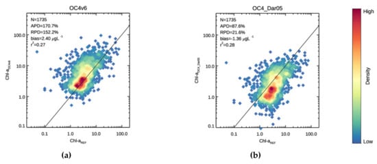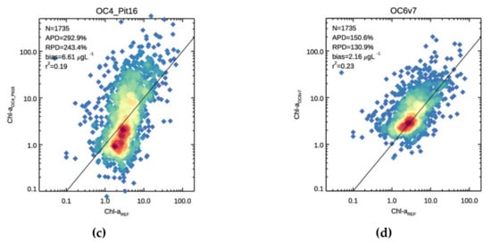 Scatterplots of the satellite-derived and in situ co-located observations for the band-ratio algorithms. Data points are color-coded by density. The continuous line represents the 1:1 ratio. (a) NASA’s standard OC4v6 (Chl-aOC4v6), (b) the regional parametrization of OC4 ([30]), (c) the regionally recalibrated OC4v6 [29], and (d) NASA’s OC6v7.