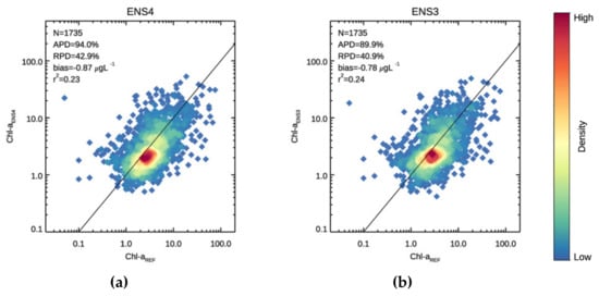 Scatterplots of the satellite-derived and in situ co-located observations for the two ensembles. Data points are color-coded by density. The continuous line represents the 1:1 ratio. (a) : four-element ensemble (, , , ), and (b) : three-element ensemble (, , ).