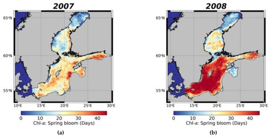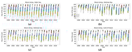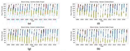 The spring bloom dynamics are described both in terms of spatiotemporal coverage of the subsurface blooms and with the statistics for the bloom onset proposed by Groetsch et al. [73]. The occurrence of spring bloom conditions (from February to early June, i.e., over days 31–160) is thus detected on a daily basis for each pixel in the basin using a spatially variable threshold set at 5% above the median concentration of the spring observations [73,74]. The statistics for the bloom onset, i.e., the distribution of the start as well as the peak and the end days, were calculated for each pixel in the basin and summarized using the HELCOM sub-basins [75].