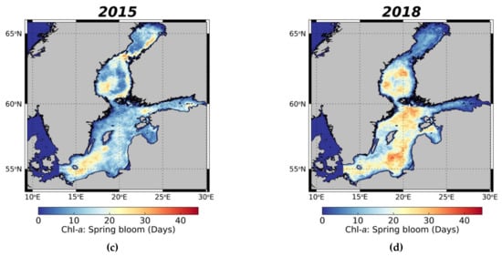 Spring bloom spatio-temporal coverage for the whole Baltic Sea. (a) 2007, (b) 2008, (c) 2015, and (d) 2018.