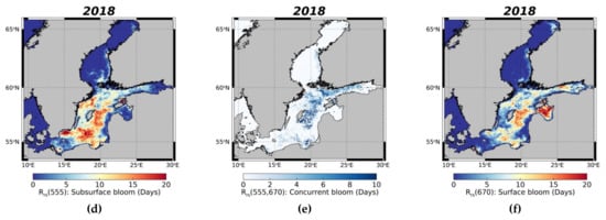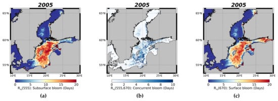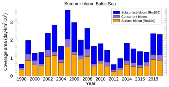 For the cyanobacterial summer blooms, the spatiotemporal coverage is aggregated from estimates of daily subsurface and surface bloom, similarly to the HELCOM environmental reporting [76,77]. Summer blooms are detected on daily images from June to September (i.e., days 161 to 270) by applying the thresholds on at the wavelength of 555 and 670 nm defined in [78] based on visual inspection of pseudo true-color composites of MODIS imagery. These thresholds were set at > 4.25 × 10−3 sr−1 and > 1.22 × 10−3 sr−1 for the subsurface and surface blooms, respectively. This -based approach to detect cyanobacterial blooms allows overcoming the difficulty of retrieving accurate values in summer bloom conditions, as highlighted in [79,80,81]. Moreover, as cyanobacterial blooms are extremely patchy and the surface scum is unlikely to totally cover a 1 km resolution pixel [79,80,81], it is possible for both thresholds to be exceeded concurrently.