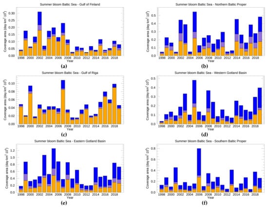 Following Hansson and Håkansson [82], cumulative maps were computed from the daily subsurface and surface images for each year and then summarized as a spatiotemporal coverage (day·km2) for both spring and summer.