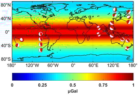 De Viron et al. [] simulated nearly 2000 earthquakes with different source mechanisms and locations around the world by the EOF method. The results show that with the accuracy and resolution of the current GRACE, the possibility of retrieving signals of earthquakes exceeds 98% and 33% for earthquakes with magnitude above 9.0 and magnitude 8.3, respectively. Cambiotti et al. [] simulated 291 coseismic and postseismic signals from different earthquake sources and concluded that the next generation of gravity satellite (NGGM) can detect the coseismic and postseismic signals of earthquakes with magnitude above 7.8, and the magnitude threshold can be reduced to 7.0 if the background model has high precision.