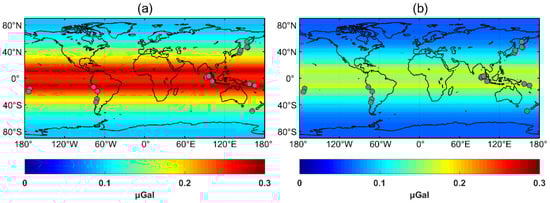 Taking the average error of the GRACE monthly model (as shown in Figure 2) as the monthly model error, Figure 3 shows the GRACE and GFO error distribution derived by the stacking method, i.e., from Equation (6). According to Figure 3, for the error of GRACE and GFO, the amplitude is in the range of 0.10~0.28 µGal and 0.06~0.18 µGal, and the average error is 0.22 µGal and 0.14 µGal in latitudinal regions of −45°~45°, respectively.