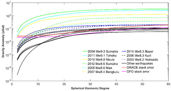 Coseismic gravity variations of earthquakes above Mw8.0 were derived by the method introduced in Section 2.1, and then further expanded to SH coefficients up to degree 60. Figure 4 shows the distributions of model prediction and GRACE model errors in terms of degree. The red solid line is the GRACE stack error curve calculated by the average error stds of GRACE RL06 163 monthly models based on the error propagation law, while the magenta solid line is the GFO stack error curve calculated by GFO 24 monthly models. The other lines are the degree variance distribution curves of signals of earthquakes above Mw8.0.