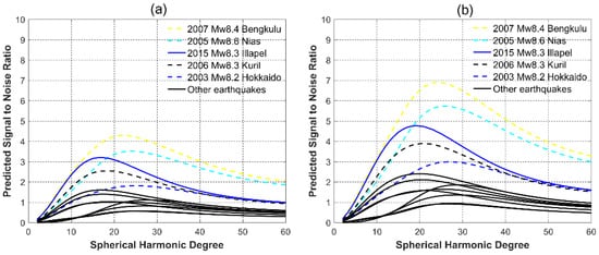 The cumulative degree variance amplitudes of the 2004 Mw9.1 Sumatra–Andaman, 2010 Mw8.8 Maule, 2011 Mw9.0 Tohoku and 2012 Mw8.6 Indian Ocean earthquakes are significantly greater than the errors of the stacking method at degree 60, and other earthquakes are equal to or smaller than the errors. In order to further compare the magnitudes between other coseismic signals and GRACE errors, the ratios of the model predictions to the cumulative stack errors (i.e., SNR) in the spectral domain are derived as shown in Figure 6a. Please note that the SNRs of the 2004 Mw9.1 Sumatra–Andaman, 2010 Mw8.8 Maule, 2011 Mw9.0 Tohoku and 2012 Mw8.6 Indian Ocean earthquakes are not presented in Figure 6a, because the values of these earthquakes are significantly larger than those of other earthquakes. According to this figure, the high SNR of coseismic changes is mainly distributed in the low degrees, and the distribution and peak position of SNR for different earthquakes are different due to the differences in the source mechanism. The 2005 Mw8.6 Nias and 2007 Mw8.4 Bengkulu earthquakes have obviously higher SNR than other earthquakes in Figure 6a. Among the detected earthquakes, the SNR of 2005 Mw8.6 Nias is the smallest. However, it arrives at 1.86 at degree 60, but other earthquakes that have not been detected so far all have an SNR less than or close to 1. It should be noted that, although the SNRs of 2015 Mw8.3 Illapel, 2006 Mw8.3 Kuril and 2003 Mw8.2 Hokkaido earthquakes are all approximately 1, it is difficult to detect the coseismic signals using GRACE time-variable products. This may be caused by the influences of other factors, such as strip errors, hydrological signals, etc., which will be discussed in the next section. Hence, considering the influences of other factors, in order to detect earthquake signals using GRACE products, the SNR needs to be larger than 1 up to degree 60, such as 1.8.