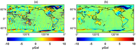 Figure 7 shows the global gravity changes from GRACE observations by the stacking method between the mean signals of 2011 + 2012 and 2009 + 2010. Figure 7a presents the results without any filter and shows obvious “north–south strip” error due to the correlated errors of SH coefficients. As shown in Figure 7b, the strip error was effectively suppressed with 300 km Gaussian smoothing. It should be noted that if a decorrelation filter is also used, the strip error could be better suppressed []. However, the signal would also be attenuated or distorted [,], and thus a decorrelation filter is not applied in this study.