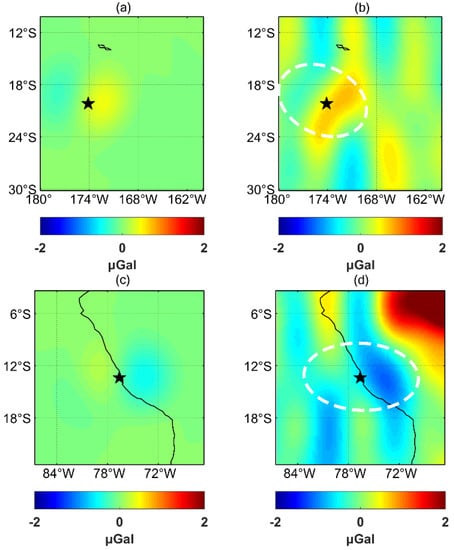 Coseismic gravity change in the 2006 Mw8.0 Tonga and 2007 Mw8.0 Peru earthquake region, respectively. (a) The dislocation model prediction of 2006 Mw8.0 Tonga. (b) Coseismic gravity changes by stacking method in the 2006 Mw8.0 Tonga region. (c) The prediction of 2007 Mw8.0 Peru. (d) Coseismic gravity changes in Peru region. The white dotted lines represent “similar coseismic signals”.